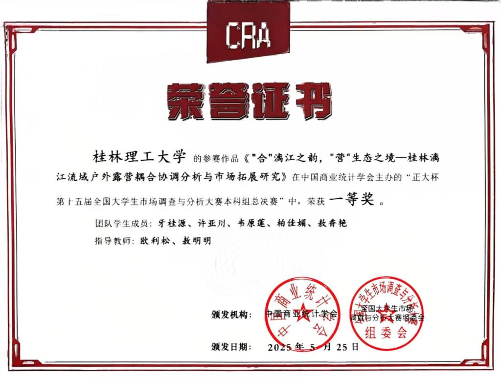 5月24至25日,由中国商业统计学会主办、正大集团冠名、浙江财经大学承办的“正大杯”第十五届全国大学生市场调查与分析大赛本科组落下帷幕。本届大赛本科组共有995所学校,28.2万名学生报名参赛。全国共61353支团队参加了校赛,10946支团队参加了省赛。经过激烈角逐,共有386支团队胜出并成功参加了全国赛初赛,经过7个月的层层选拔,最终有273支团队脱颖而出,成功晋级全国总决赛。最终,桂林理工大学参赛队伍在激烈的全国总决赛中表现突出,参赛作品《“合”漓江之韵,“营”生态之境——桂林漓江流域户外露营耦合协调分析与市场拓展研究》荣获全国一等奖,充分展现了我校学子扎实的专业素养与出色的实践能力。