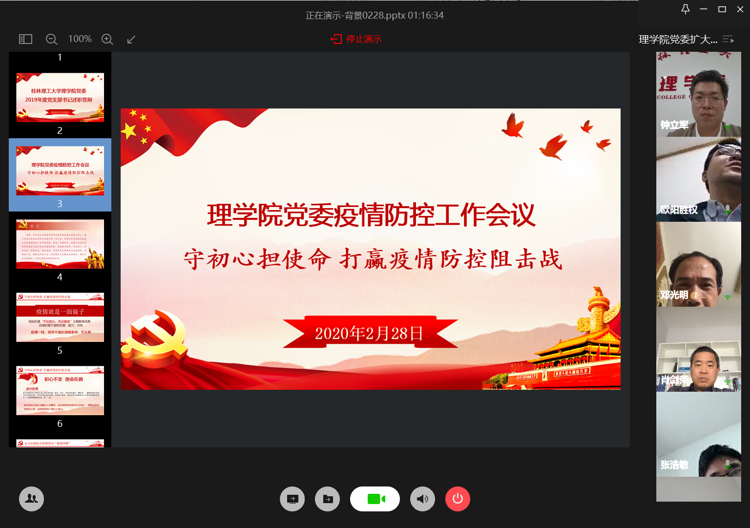 为坚决贯彻落实党中央国务院关于疫情防控的决策部署,贯彻落实教育部“两联防”“两确保”和“十严格”要求,切实做好新型冠状病毒感染的肺炎疫情防控工作,2月28日下午,理学院召开疫情防控工作网络视频会议,会议由学院党委书记欧阳胜权主持,学院党委副书记、院长肖剑荣、党委副书记钟立军、副院长张富文、蒋远营、李明,院长助理张浩敏、党委委员邓光明以及各党支部书记参加会议。