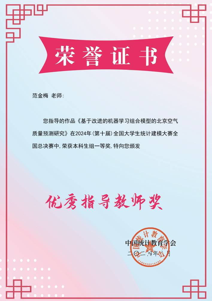 近日,2024年(第十届)全国大学生统计建模大赛决赛答辩在陕西西安落幕,自2月开赛以来,全国共有802所院校,21386支队伍,64158名大学生参赛,经过校赛、省赛、国赛通讯评审、现场会议评审和现场答辩赛角逐,最终评选出国家一等奖60支,国家二等奖119支,国家三等奖408支。我院刘纯铜、韩晴及何小梅三人组成的代表队在范金梅老师的指导下,凭借扎实的专业素养和出色的团队协作精神,其参赛项目《基于改进的机器学习组合模型的北京空气质量预测研究》在本科生组总决赛中荣获全国一等奖。该项目深入挖掘了2013-2023年北京的空气质量数据,运用专业知识构建模型,为空气污染防治提供了创新思路和方法。