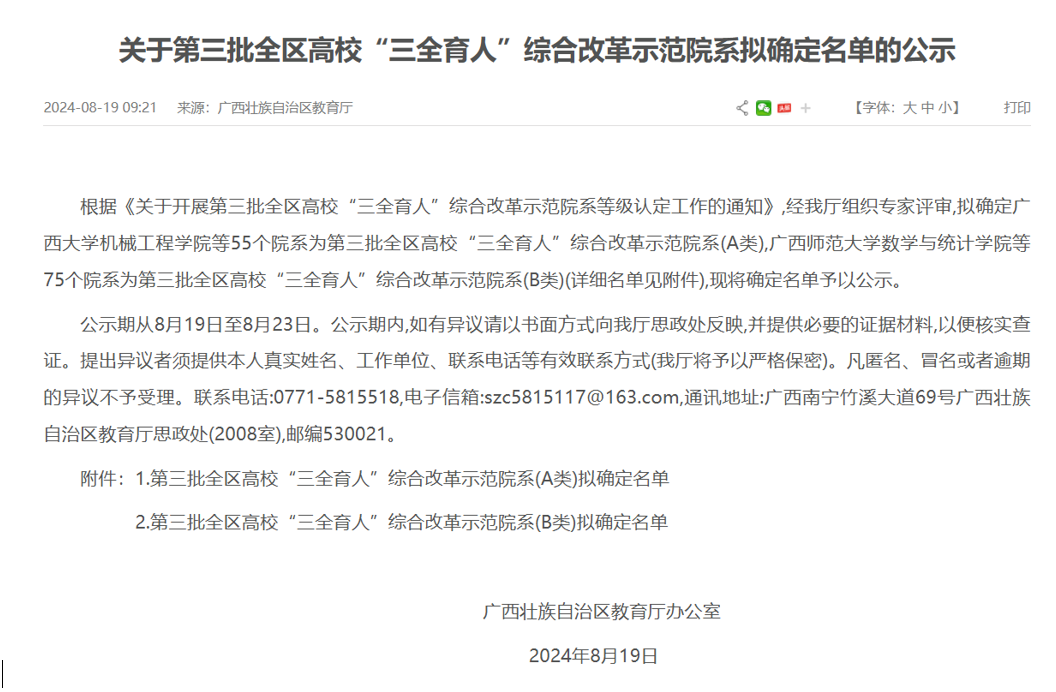 8月19日,beat365手机版官网入口成功入选第三批全区高校“三全育人”综合改革示范院系(A类),标志着学院在立德树人和综合育人方面取得的显著成效。