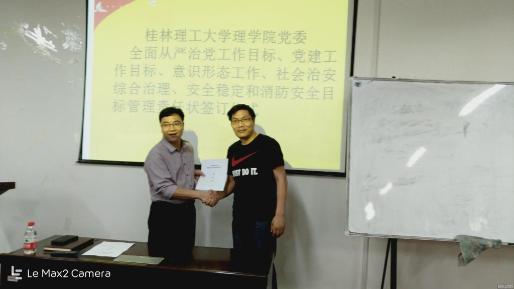 2018年5月15日下午,学院党委、行政在雁山校区会议室召开会议,传达学校关于党建、从严治党、意识形态、社会治安综合治理等会议精神,并举行党建工作责任状、意识形态工作责任状、从严治党工作责任状和社会治安综合治理工作责任状签订仪式,全体院领导和中层干参加会议并相互签署责任状。陆平书记首先传达学校有关会议精神,然后就责任状相关内容进行了要求,对相关领导干部提出了具体要求。他要求每位干部都要严格要求自己,按照责任状规定的目标落实工作,对工作完成情况与年终绩效挂钩,通过自身垂范,带动科室老师齐心协力,共同奋斗,圆满完成各项工作。