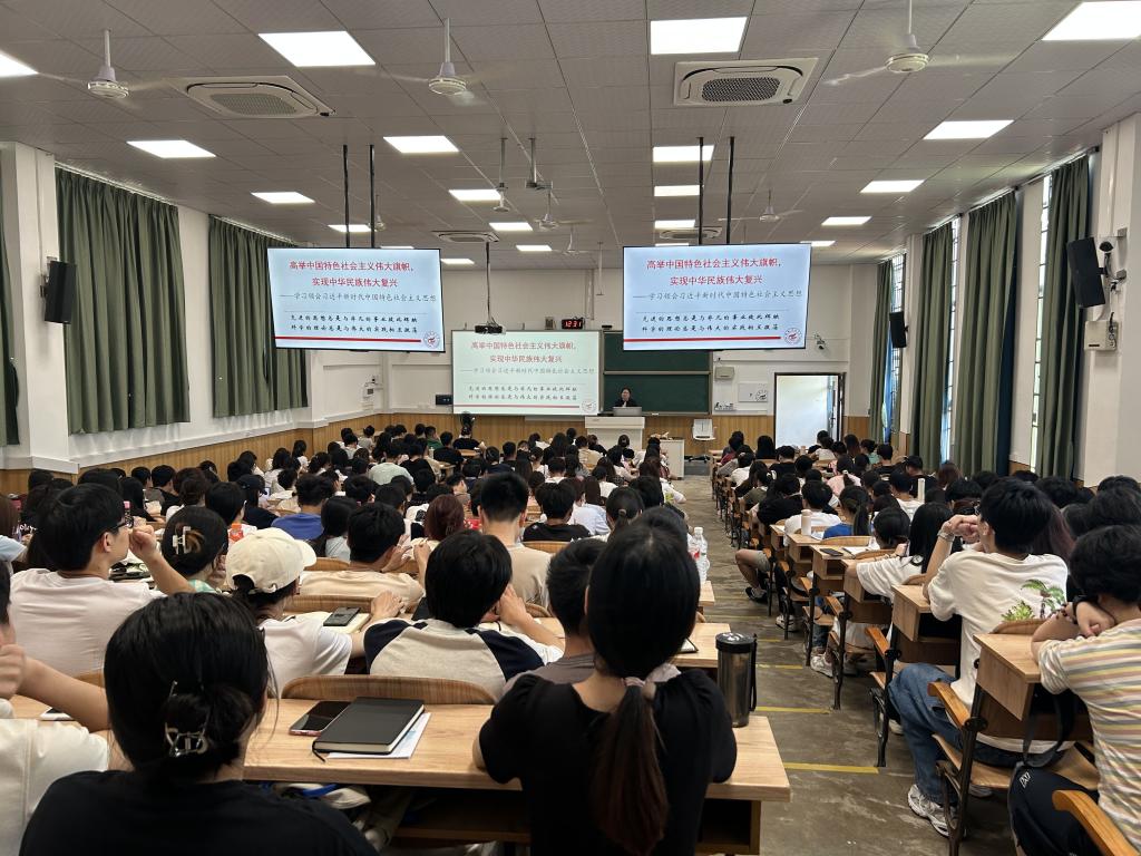党课中,江玲书记从中国特色社会主义进入新时代、当今世界经历新变局、中华民族伟大复兴面临新考验以及科学社会主义焕发新生机等四个方面,深入浅出地给学生全面阐释了习近平新时代中国特色社会主义思想形成的历史条件和时代背景。