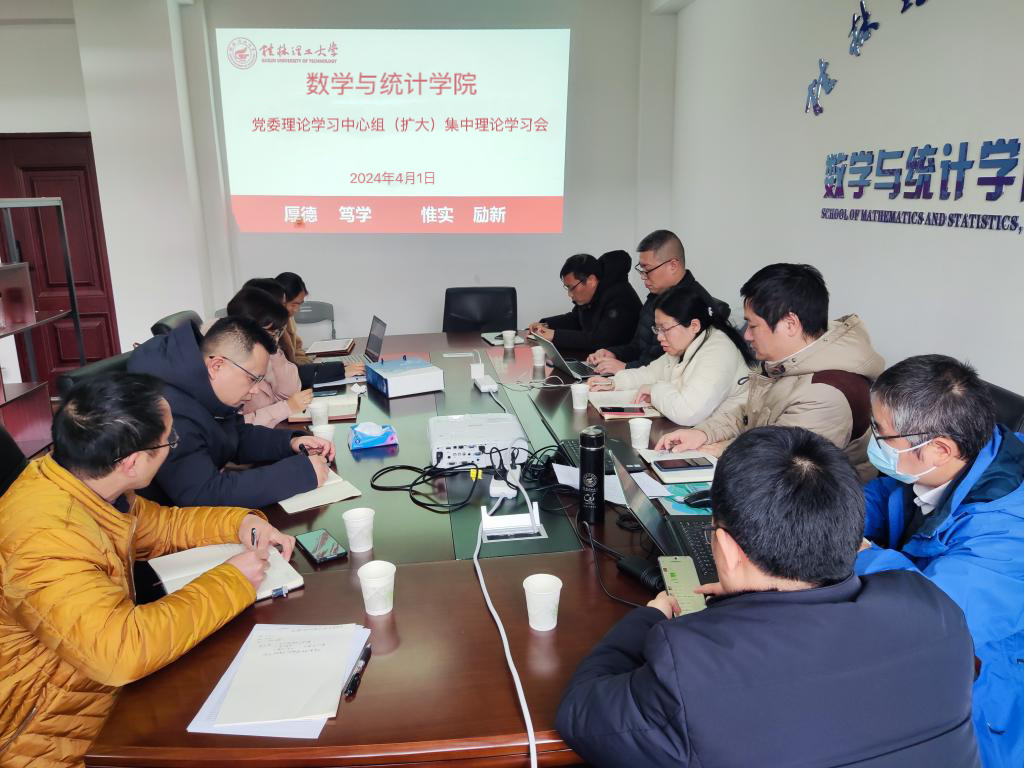 4月1日,学院在屏风校区1409会议室举行党委理论学习中心组(扩大)理论学习会,深入学习宣传贯彻习近平总书记对广西重大方略要求、习近平总书记在中共中央政治局第十一次集体学习时关于加快发展新质生产力、扎实推进高质量发展时的重要讲话精神、习近平总书记在全国两会期间的重要讲话和全国两会精神、习近平总书记在湖南考察时的重要讲话精神,坚持系统学习、融会贯通、一体贯彻。