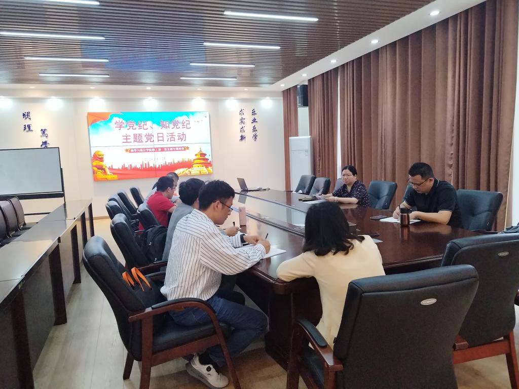 4月25日,我院教工第一党支部在雁山校区08201会议室开展党纪学习教育专题党课,学习新修订的《中国共产党纪律处分条例》。党课由支部书记曾翔同志主持,学院党委书记江玲主讲,支部全体在校的党员同志参加党课学习。