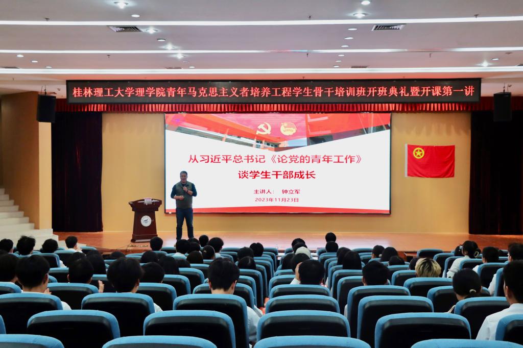 为深入学习贯彻习近平新时代中国特色社会主义思想和党的二十大精神,持续推进青年马克思主义者培养工程,beat365手机版官网入口于2023年11月23日晚在雁山校区图书馆报告厅举办第四期青年马克思主义者培养工程学生骨干培训班开班典礼暨开课第一讲。学院党委副书记钟立军老师出席本次活动,团委、学生会全体成员,各社团和协会代表,23级班长和团支书等青马班成员参加本次活动,活动由学院团委副书记彭娇娇老师主持。