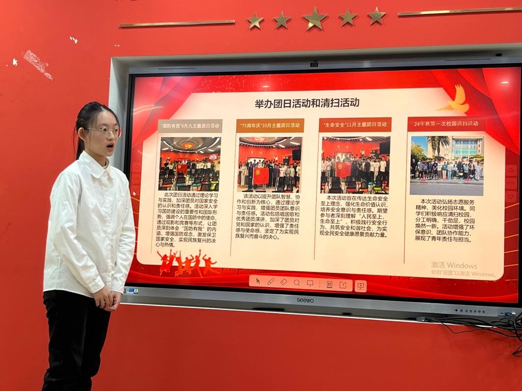 会议伊始,彭娇娇老师简要回顾了学院 2024 年共青团工作,并强调了基层团支部发挥的重要作用以及团支部书记述职评议考核工作的重要意义。她对本次述职大会提出三点要求:一是要加强自我修养,不断提升自身的综合素质和业务能力;二是要守正创新,丰富团日活动形式和工作方法,不断增强团组织的吸引力和凝聚力;三是要强化服务意识,把服务大局、服务青年作为工作的出发点和落脚点,努力成为同学们信赖的贴心人。随后,团支部结合PPT依序进行述职报告与经验分享。述职过程中各团支部聚焦重点工作与特色活动,深入汇报工作成果、经验及未来规划。