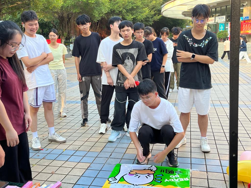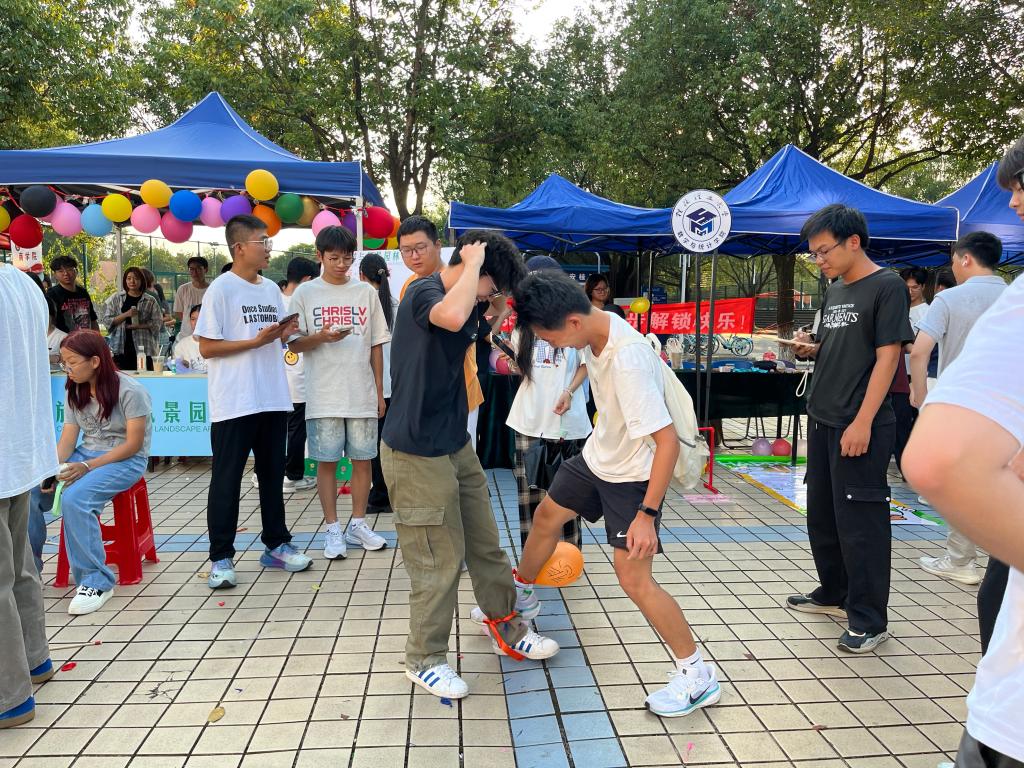 参与学生脚踝绑缚写有“焦虑”“压力”等关键词的“情绪气球”,通过互踩完成“1-2-3”计数挑战。先清零者赢得3秒“通关卡”,笑声盖过爆破声,焦虑值瞬间归零。