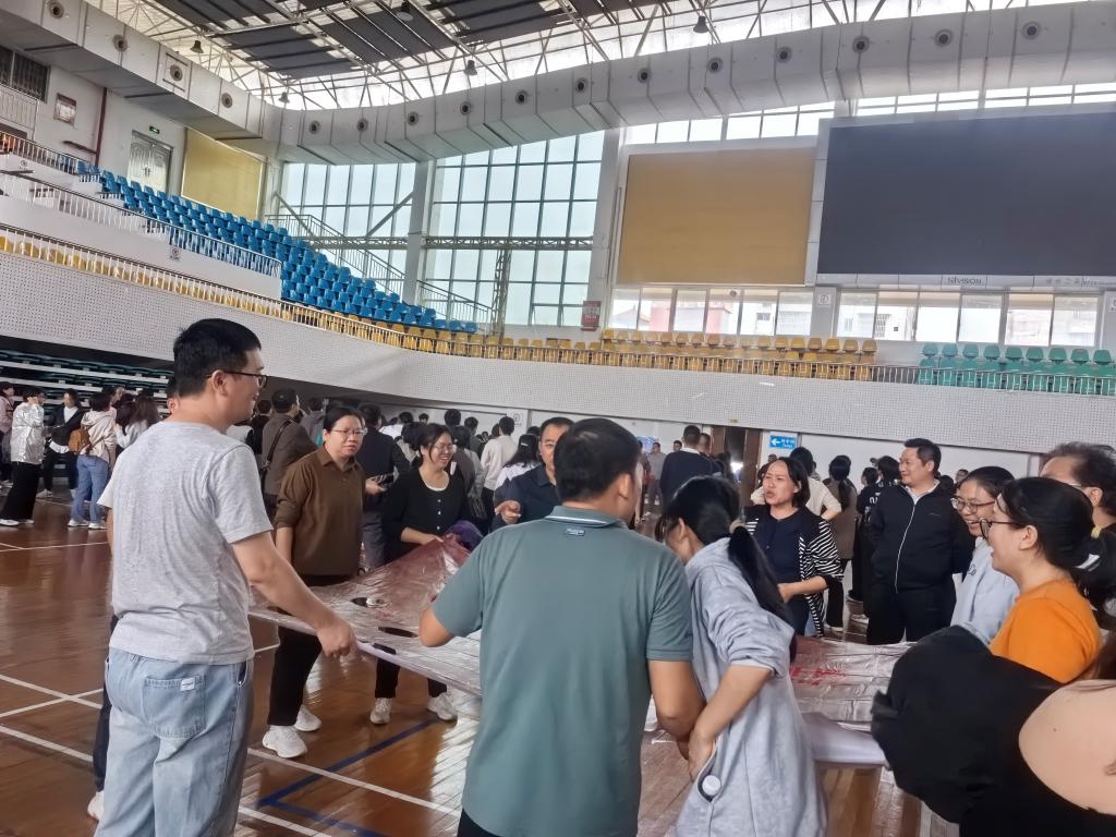 快乐运动会总共有四个项目。第一个项目是“精准发力创新篇”,此项目由6名老师上场。前5名老师都要手拎矿泉水瓶的绳子,用矿泉水瓶将地上原位纸杯全部垒在一起。此后将垒起的杯子按位置放回原位,最后将矿泉水瓶拿回起点,传给下一位老师。第6名老师只需要用矿泉水瓶将地上原位的纸杯全部垒在一起,然后跑回起点。这整个过程需要大家精准发力并且完成接力。这个项目数统学院获得了第二名。第二个项目是“智勇并进破雄关”,这个项目分两个环节进行,需要12名老师上场。在第一环节中,由于老师们在使用石头剪刀布猜拳时用时较多,导致整个过程用时较多,但最后大家都圆满完成了第二环节的活动。第三个项目是“携手共进新征程”,此项目需要8名老师上场,第一环节是每两名老师站在起点并用环套住两人各一只脚,两人合力运送环到另一头并套在矿泉水瓶上,之后返回来与下一对击掌接力,直至四组都完成后,进入重走长征路环节,此项目数统学院获得了二等奖。最后一个项目是“薪火相传续辉煌”,此项目数统学院获得了二等奖。