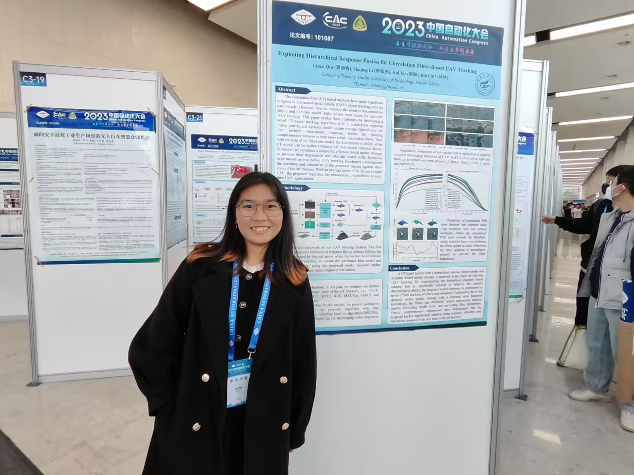 由我院信息与计算科学专业2020-2班覃丽梅和2021-1班李家庆共同撰写,信科教研室林彬和谢海两位老师共同指导的学术论文《Exploiting Hierarchical Response Fusion for Correlation Filter-Based UAV Tracking》被大会论文集收录,近期将提交至EI数据库检索。论文提出了一种面向无人机视频的视觉目标跟踪算法,通过在相关滤波跟踪框架中引入分层响应图融合和自适应模型更新策略,算法在应对尺度变化、相似物干扰、遮挡等复杂场景时的跟踪稳定性得到提升,并在多个无人机跟踪数据集的评测中取得了较为优异的跟踪性能。该论文是自治区级大学生创新创业训练计划项目(编号:202210596340)产出的科研成果。覃丽梅同学作为论文第一作者赴现场参会,通过海报的形式展示了论文的主要内容和创新点,并同其他与会者们进行了广泛而深入的学术交流。