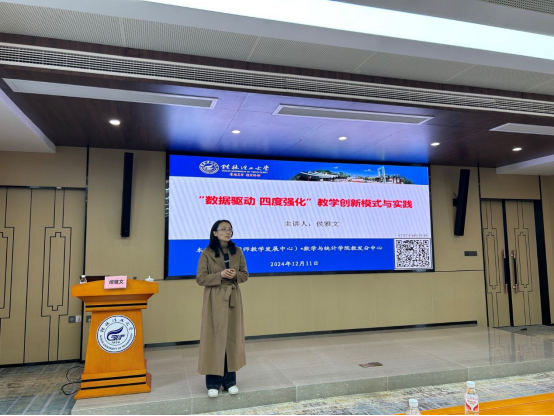 在介绍教学创新的具体实施路径时,侯雅文副教授结合自己丰富的实践经验,详细讲解了如何运用“数据驱动 四度强化”教学模式来推动教学创新。她强调,知识深度的交叉融合、实践反哺课程教学、技术平台助力学习以及思政育人的协同机制是这一模式的核心要素,它们共同构成了教学创新的重要支撑。