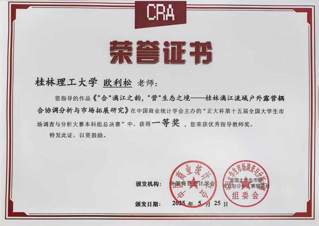 5月24至25日,由中国商业统计学会主办、正大集团冠名、浙江财经大学承办的“正大杯”第十五届全国大学生市场调查与分析大赛本科组落下帷幕。本届大赛本科组共有995所学校,28.2万名学生报名参赛。全国共61353支团队参加了校赛,10946支团队参加了省赛。经过激烈角逐,共有386支团队胜出并成功参加了全国赛初赛,经过7个月的层层选拔,最终有273支团队脱颖而出,成功晋级全国总决赛。最终,桂林理工大学参赛队伍在激烈的全国总决赛中表现突出,参赛作品《“合”漓江之韵,“营”生态之境——桂林漓江流域户外露营耦合协调分析与市场拓展研究》荣获全国一等奖,充分展现了我校学子扎实的专业素养与出色的实践能力。
