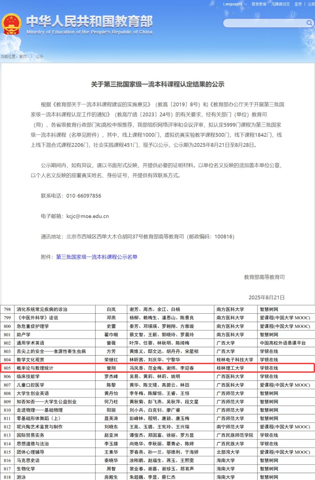 8月21日,教育部高等教育司公布《关于第三批国家级一流本科课程认定结果的公示》,beat365手机版官网入口课程《概率论与数理统计》成功入选“国家级线上一流本科课程”,标志着学院课程建设进一步实现突破。