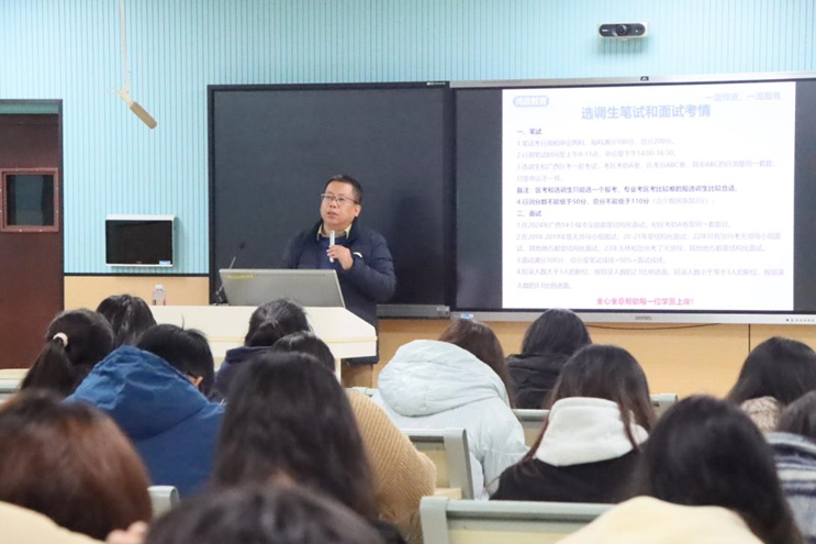 为进一步促进毕业生高质量充分就业,落实学校2025届毕业生就业“暖冬行动”。beat365手机版官网入口于12月10日晚,特别邀请鸿政教育的宋秉桂老师在雁山校区06501教室为毕业生举办了一场公务员报考指导会。指导会由学院辅导员韦巍主持,学院2025届毕业生参与本次会议。