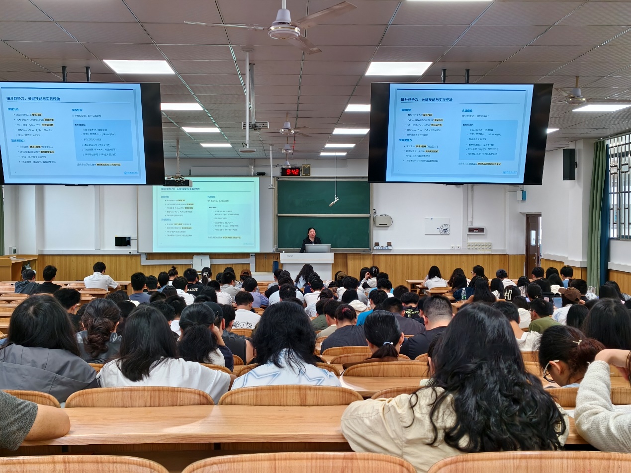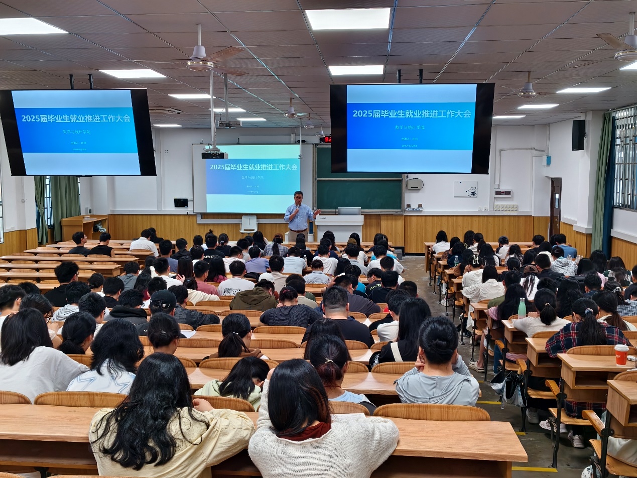 为助力毕业生明确就业方向、提升就业竞争力,5月29日上午,beat365手机版官网入口在雁山校区06409教室召开2025届毕业生就业推进工作大会。学院党委书记江玲、党委副书记钟立军、团委书记兼毕业班辅导员李艮及全体毕业生参会,会议由钟立军主持。 会上,江玲围绕“挑战与机遇并存”的就业形势展开分析。她指出,2025年高校毕业生规模预计达1200-1222万人,青年失业率16.1%,传统行业岗位收缩,但人工智能、新能源、数字经济等领域人才缺口超500万,数学统计类专业在“东数西算”等国家战略中优势凸显。她强调,统计学专业在金融、互联网、生物医药行业需求占比65%,薪资较传统专业高30%以上;信息与计算科学专业在AI算法、网络安全等岗位年薪可达50-150万元。针对就业策略,她建议学生聚焦Python编程、统计建模等核心技能,通过校企实训、学科竞赛积累经验,鼓励深造或考取CFA、FRM等证书,并关注长三角、成渝经济圈等政策扶持区域。 此次大会为毕业生理清了就业思路,明确了技能提升方向与区域选择策略,增强了毕业生应对就业挑战的信心。学院将以此次会议为契机,持续深化就业指导服务,助力毕业生实现精准就业与高质量发展。 学院党委书记江玲作就业形势分析 活动现场