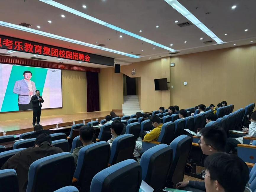随后,思考乐教育集团选聘中心总监柯锦康介绍了公司在行业内的优势地位,并分享职业规划相关内容,让同学们对集团有了全面而深入的认识。选聘中心招聘经理张焕荣、选聘中心招聘主管廖美羽分别针对本次招聘的岗位需求、招聘流程、薪资福利等关键内容进行了细致解读,为同学们提供了清晰的求职指引。思考乐教育集团新沙校区校长龙诗星结合自身丰富的教育行业经验,分享了在思考乐的职业发展路径,鼓励同学们勇于追求梦想,在教育领域施展才华。宣讲环节结束后,招聘会进入了紧张而有序的笔试和面试阶段。